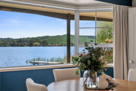Inside, an open-plan kitchen and dining area takes in sparkling lake views, flowing through to a generous lounge warmed by a solid-fuel fire. The layout encourages easy movement between living spaces and the outdoors, where a sheltered courtyard and spacious lawn create a relaxed setting for entertaining or simply soaking in the serenity.