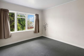 The ground floor includes a combined kitchen, dining, and lounge area, with heat pump providing warmth in cooler months. Upstairs are three bedrooms and a bathroom with separate toilet. The property is set on a crosslease title with a 1/6 share of 3077sqm.